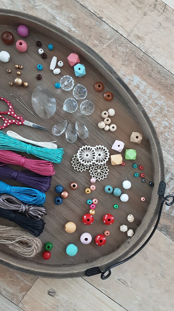 Alle anderen Materialien hat man mit Sicherheit in irgendeiner Schublade verstaut. An Perlen eignen sich alle erdenklichen Formen und Farben. Da kannst du deiner Kreativität freien Lauf lassen. Man kann auch noch viele andere Sachen mit einbauen, hauptsache sie haben Öffnungen für den Faden.
