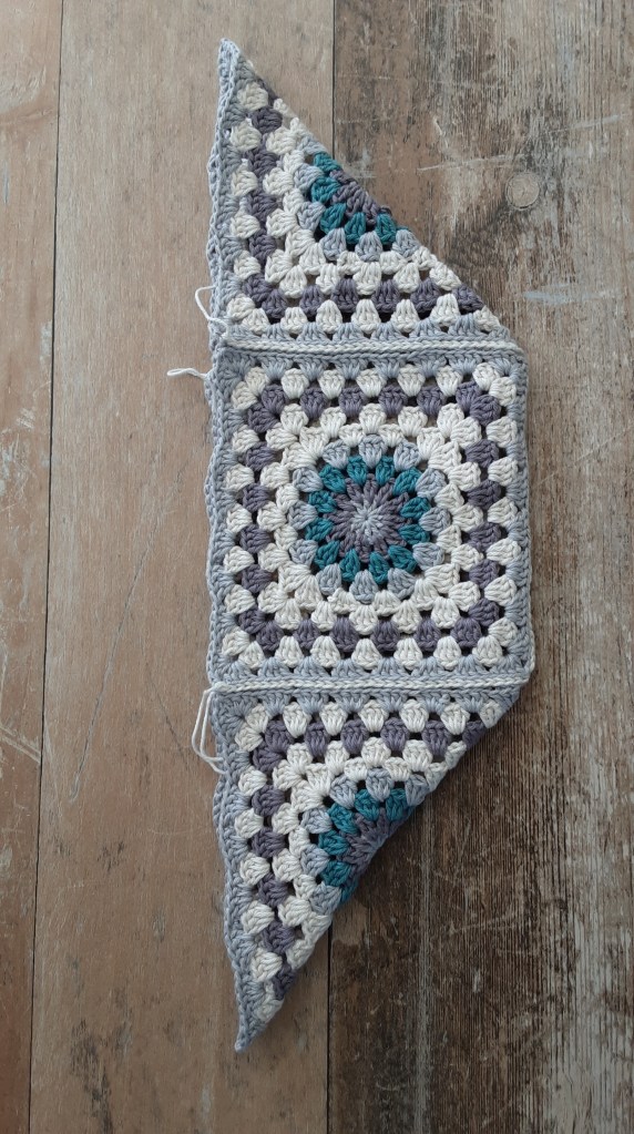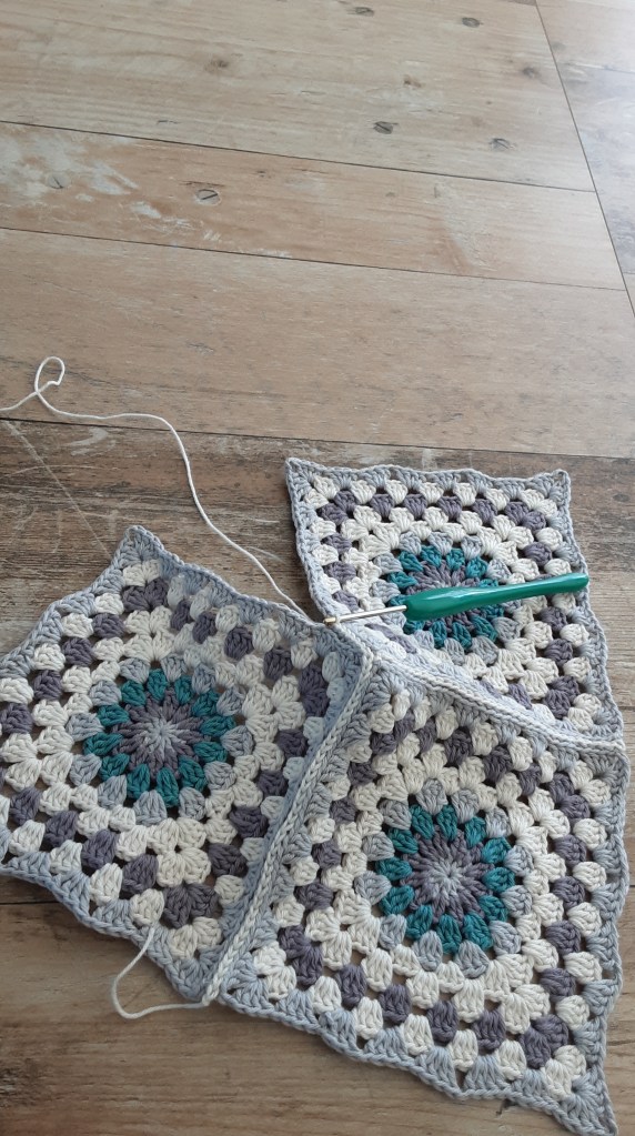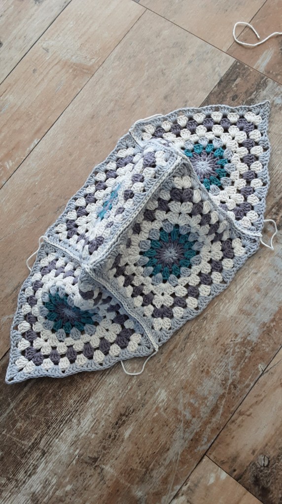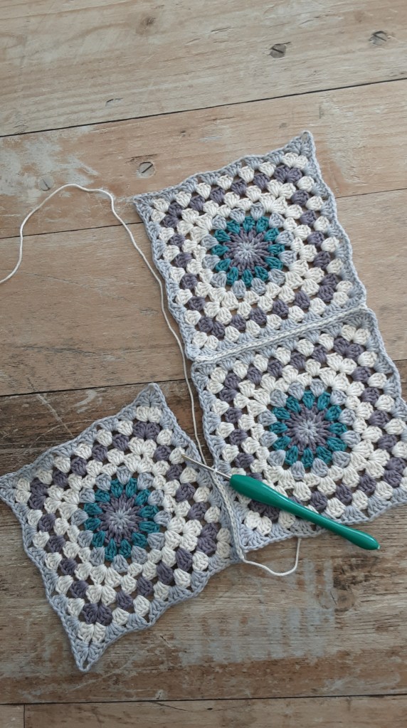 Um aus den 4 Grannys eine Tasche herzustellen, habe ich sie zusammengehäkelt. Man kann sie auch zusammen nähen- ganz wie man möchte… Zuerst hab ich 2 Quadrate an einer Seite verbunden. Danach rechts und links von den zweien je 1 Quadrat. Zum Schluß sieht es aus wie ein Schiffchen 😉