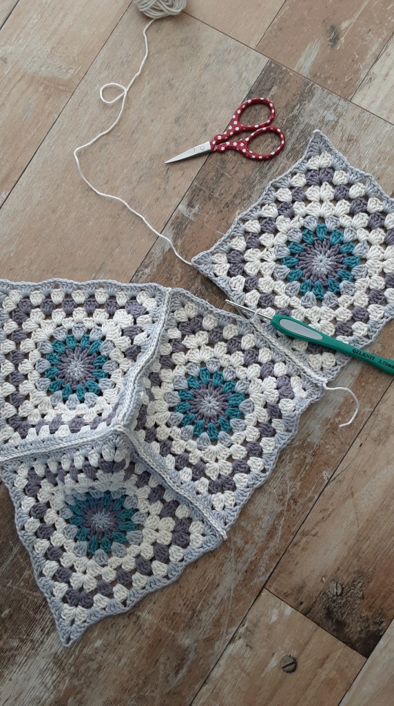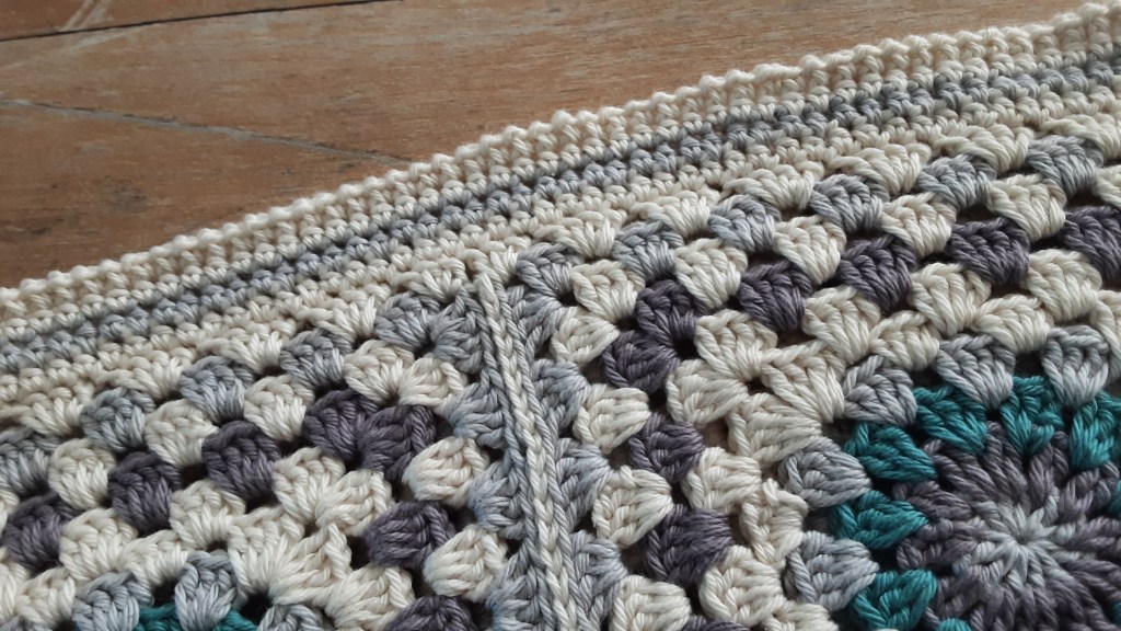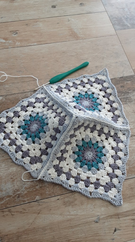 Der Hauptbestandteil sind 4 Granny Squares ca. 13x13cm groß. Ich habe ein Muster in meinen Lieblingsfarben gehäkelt. Natürlich funktionieren so ziemlich alle Häkelmuster, du musst nur auf die Größe kommen. Bei mir hat das natürlich auch nicht geklappt und somit habe ich einfach ein paar Runden mehr gehäkelt…