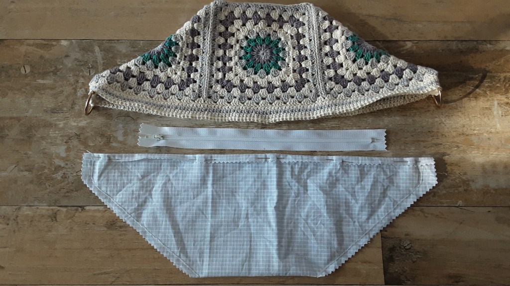 Den Innenstoff suche ich immer passend zur Farbe der Wolle aus, da ja immer etwas durchschimmert. Ich schneide ihn auf jeder Seite 1cm größer zu als die Tasche selbst ist. Zuerst nähe ich die unteren Öffnungen zusammen. Danach kommt der Reißverschluss mittig von der Stofföffnung. Wählt eine Reißverschlusslänge bei der ihr problemlos alles in die Tasche verstauen könnt. Ich arbeite mit 25cm langen Verschlüssen. Zum Schluss stecke ich den Beutel in die gehäkelte Tasche und nähe den Reißverschluss mittig an den oberen Rand.