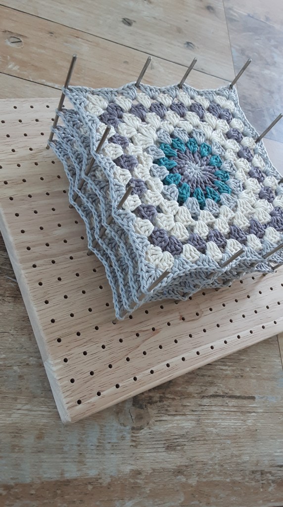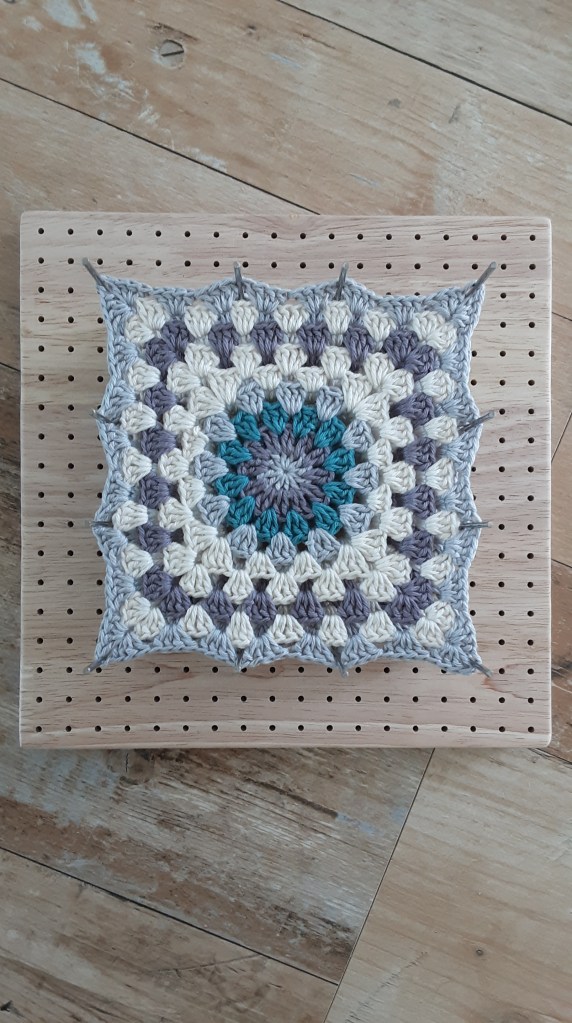 Damit man gerade Seiten und gleich große Grannys hat, spanne ich meine immer auf einem Blockierbrett *. Dazu das Granny in Wasser tränken, vorsichtig ausdrücken und mit Edelstahlstiften auf dem Brett fixieren. Wenn es getrocknet ist, hat man genau gleiche Quadrate, mit denen man wunderbar einfach weiterarbeiten kann.